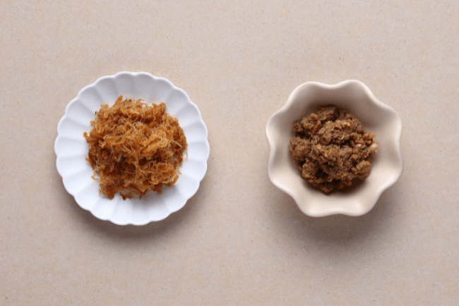 嚴選台灣在地優質豬隻的「後腿肉」部位。後腿肉筋膜少、肉質纖維長且紮實,經過師傅傳統工法焙炒後,能呈現出一絲一絲、口感清晰的肉絲感,而非碎末狀。過程中不添加色素與人工防腐劑,保留豬肉原始的鹹香風味。