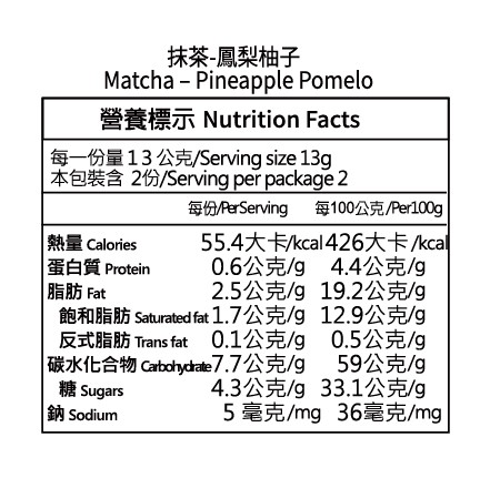 土鳳梨、金鑽鳳梨、文旦柚、昭和麵粉、紐西蘭無鹽奶油、糖、蛋、紐西蘭奶粉、抹茶粉