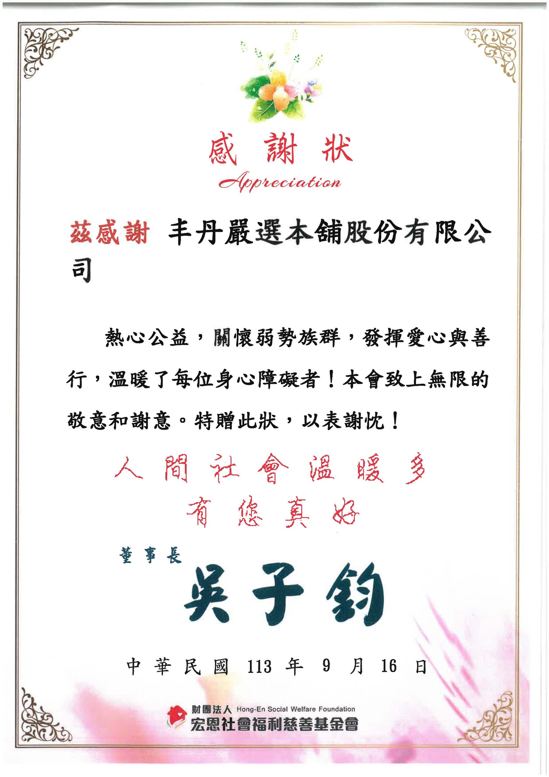 2024丰丹關懷弱勢族群 財團法人宏恩社會福利慈善基金會